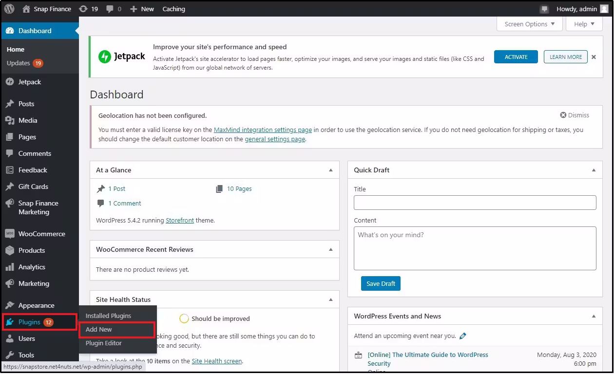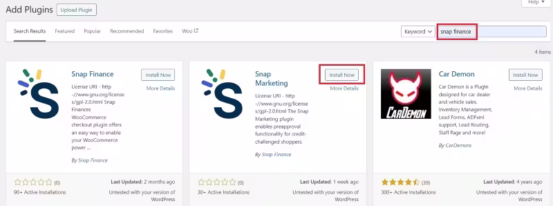 2.3. Go to Plugins > Add New. Search for “Snap Finance" using the search bar at the top right of the header and Click on Install Now button and then click on Activate button.