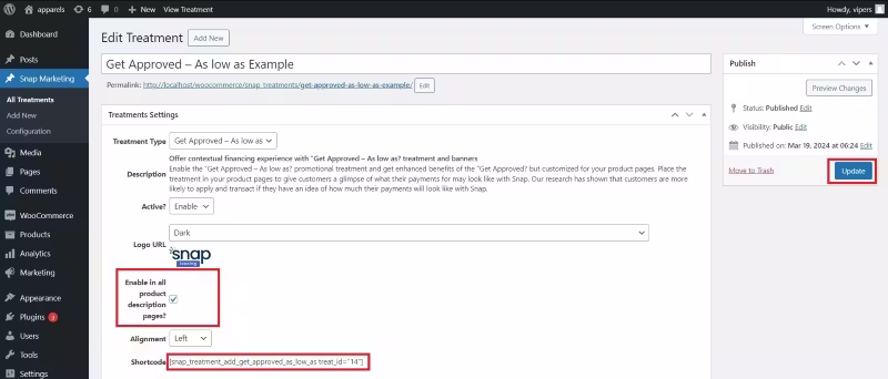 2.9. Go to Products > Edit product and paste the treatment Shortcode in the description field and Click Save.